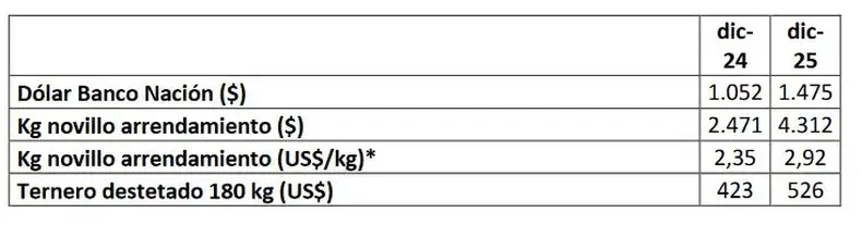 Considerando los precios en dólares del novillo arrendamiento del Mercado Ganadero de Cañuelas (MAG) para diciembre 2024 versus el mismo mes de 2025, puede evidenciarse el cambio de precios registrado en el último año.
