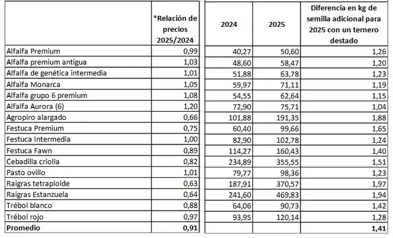 “Mientras que el precio promedio de las especies consideradas disminuyó un 9% en el último año, lo más interesante es visualizar el poder de compra del ternero: con los valores actuales de las semillas consideradas y del ternero destetado, se puede comprar en 2025 un 41% más de semillas forrajeras que para el mismo caso en 2024”, explica Lus, en el reporte de CREA.