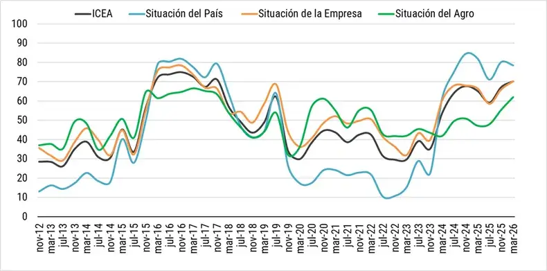 En general, el Índice de Confianza del Empresario Agropecuario (ICEA) alcanzó en marzo los 70 puntos, lo que representa un incremento del 4,5% respecto de noviembre pasado, y del 7,7% en comparación con la medición de un año atrás.