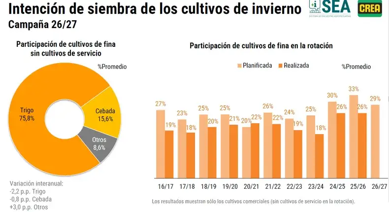 Por otro lado, en lo que respecta a las primeras estimaciones preliminares de la superficie de siembra de granos finos en el ciclo 2026/27, se advierte un descenso versus las intenciones informadas en la misma fecha del año de las últimas dos campañas. Crece el atractivo por cultivos alternativos como la colza o la avena.