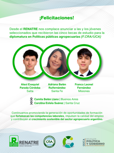 El pasado 6 de abril, el Registro Nacional de Trabajadores Rurales y Empleadores (RENATRE) otorgó cinco (5) becas de estudio para la Diplomatura en Políticas Públicas Agropecuarias (tercera edición), organizada por la Fundación de Confederaciones Rurales Argentinas (CRA) en conjunto con la Escuela de Política y Gobierno de la Universidad Católica Argentina (UCA). Las becas fueron adjudicadas en el marco de una convocatoria abierta difundida a través del sitio web institucional y las redes sociales del organismo, con el objetivo de promover oportunidades de formación académica especializada para jóvenes vinculados al ámbito rural y agropecuario.